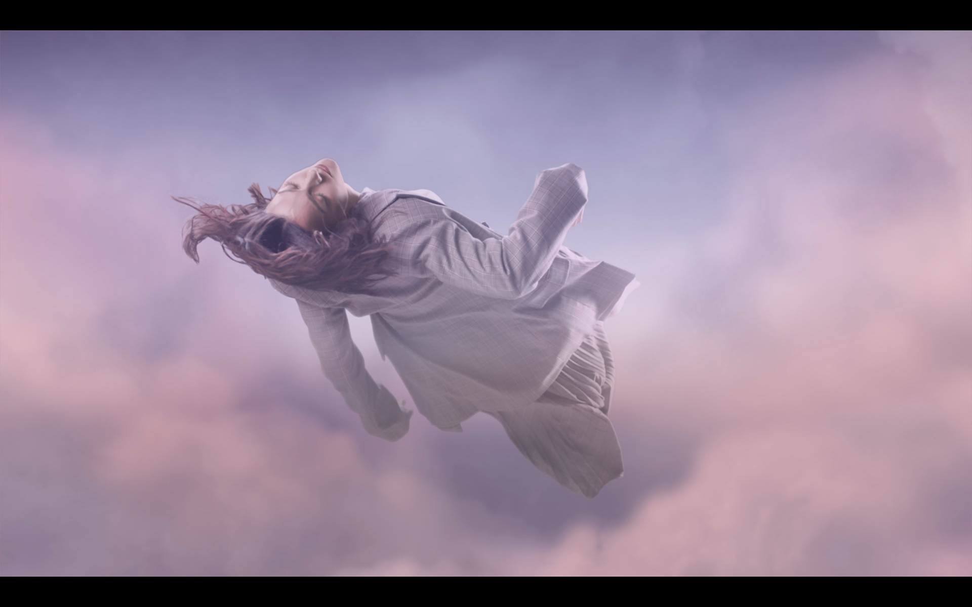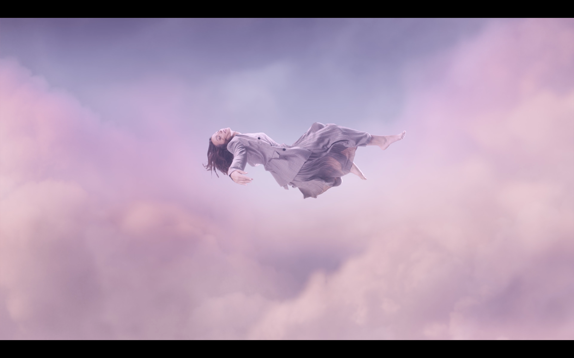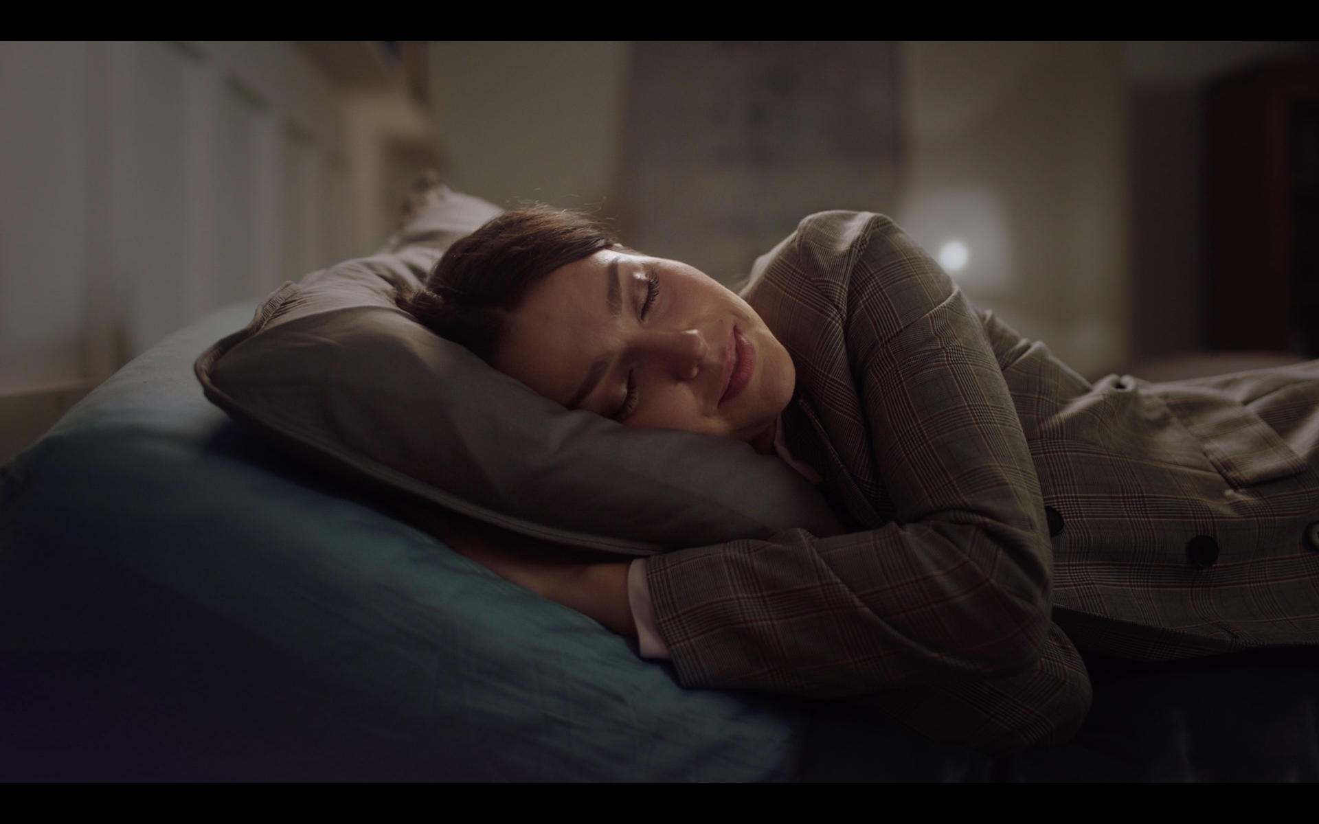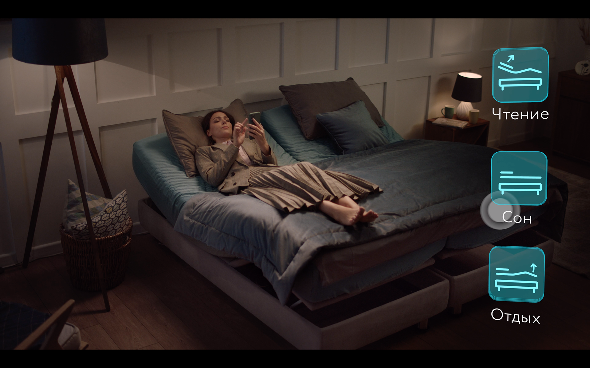 A young female architect enters her home after a tiring day. The innovative folding mattress controlled by a mobile app helps her relax making her actually sleep on a cloud.