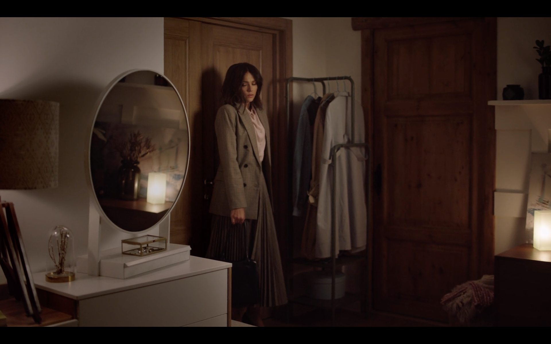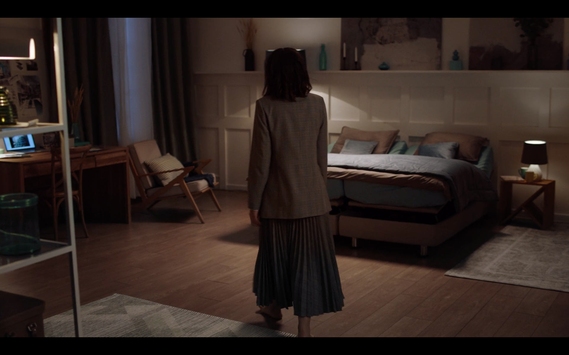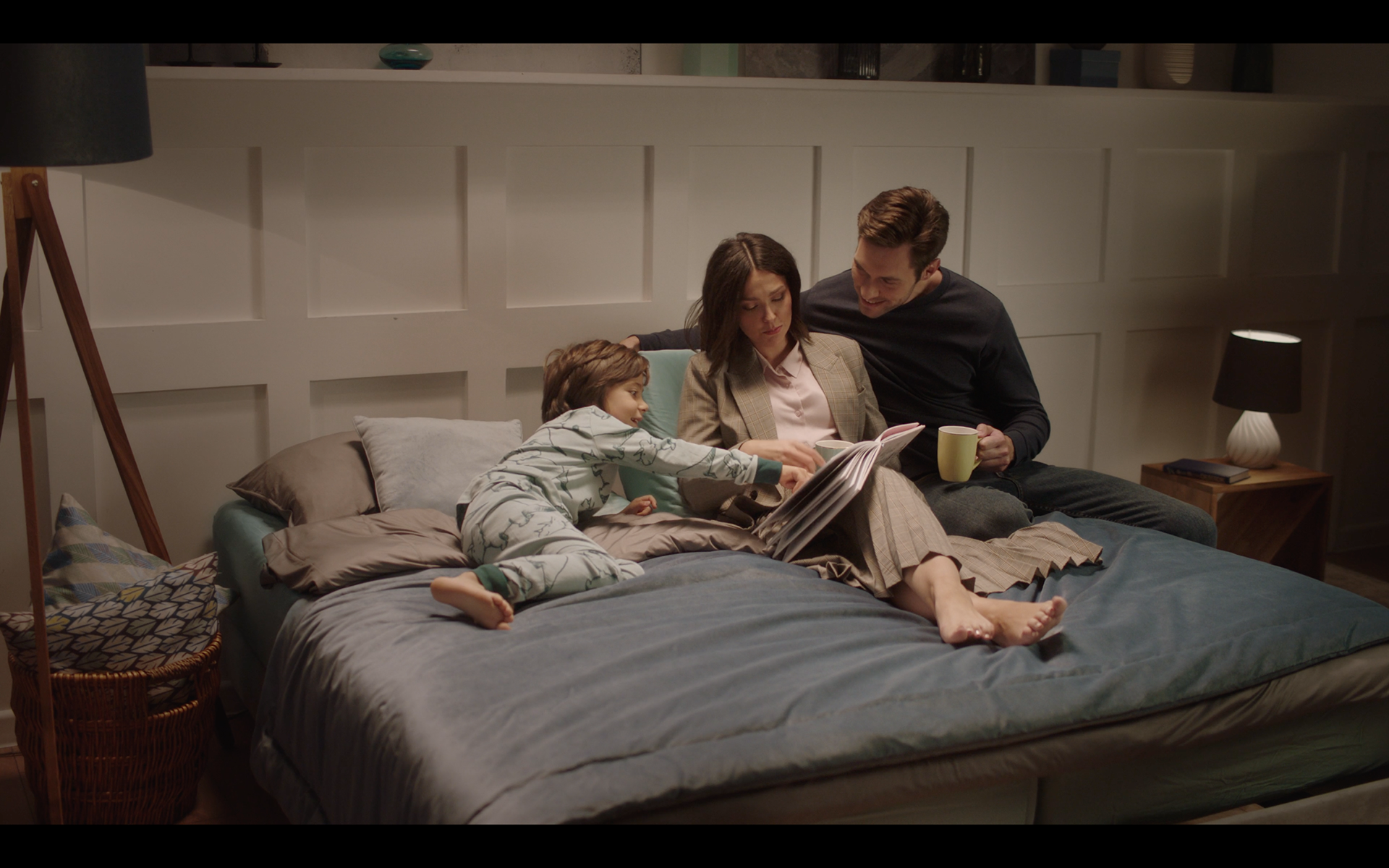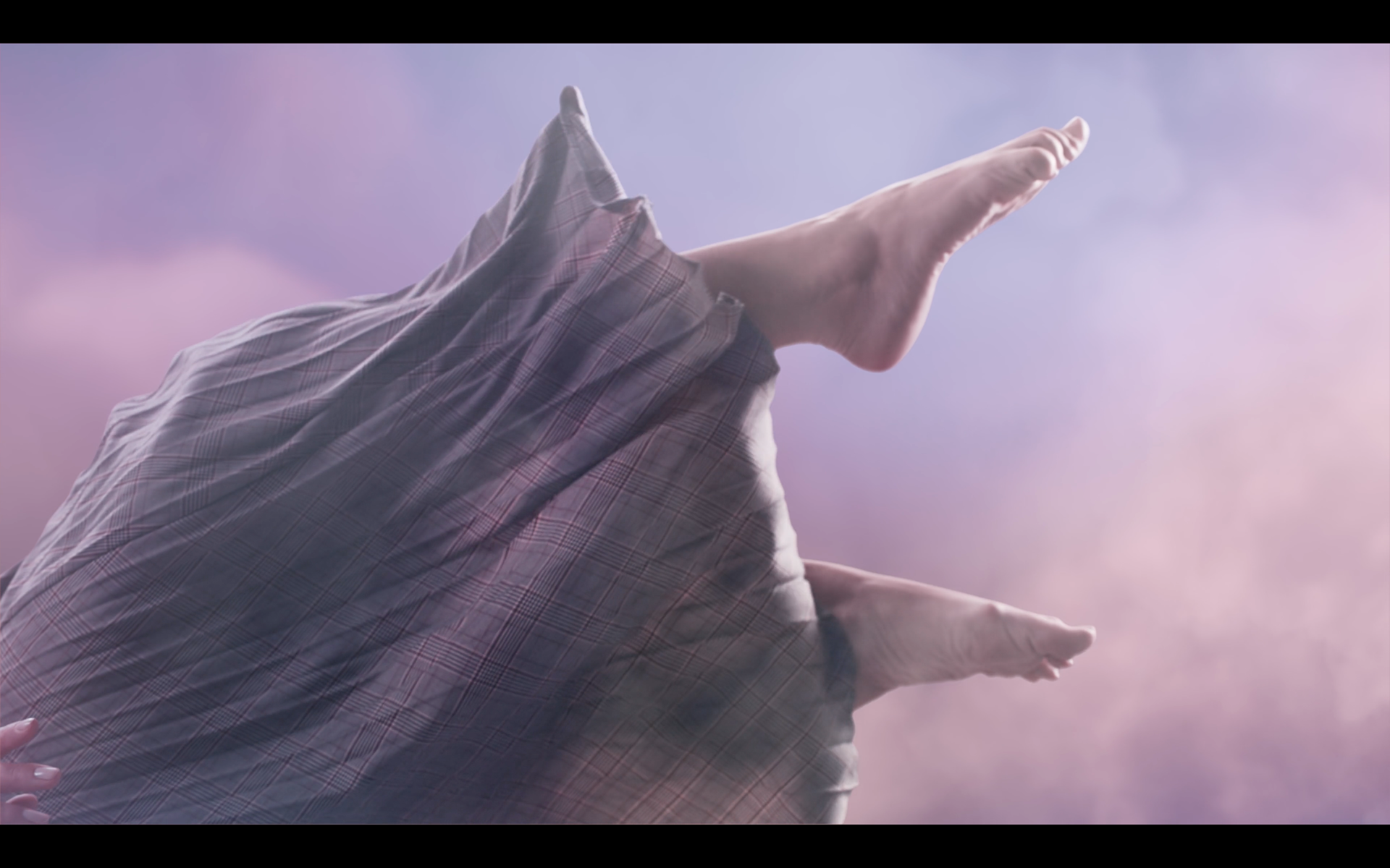 A young female architect enters her home after a tiring day. The innovative folding mattress controlled by a mobile app helps her relax making her actually sleep on a cloud.